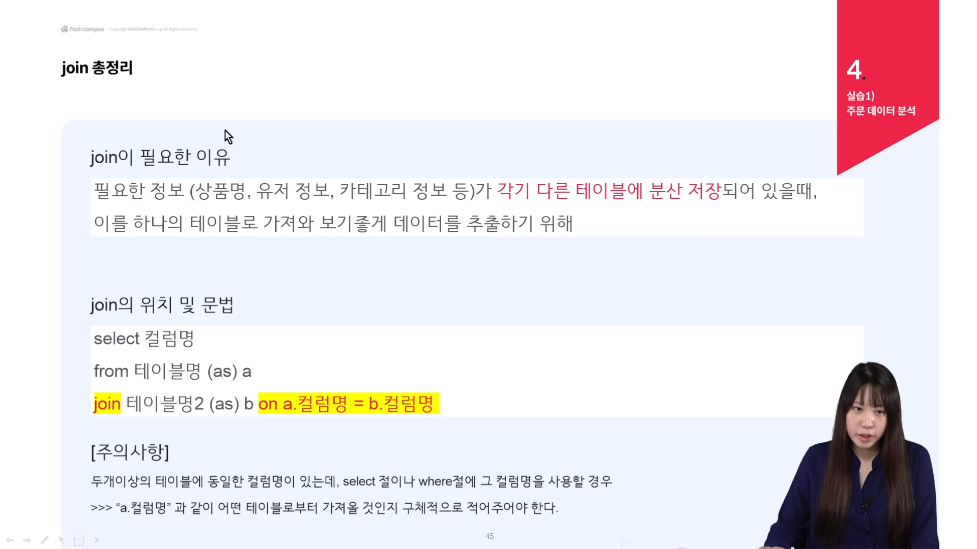 | 주문 테이블: 매출액 정보 | 상품 테이블: 상품이름 정보 |