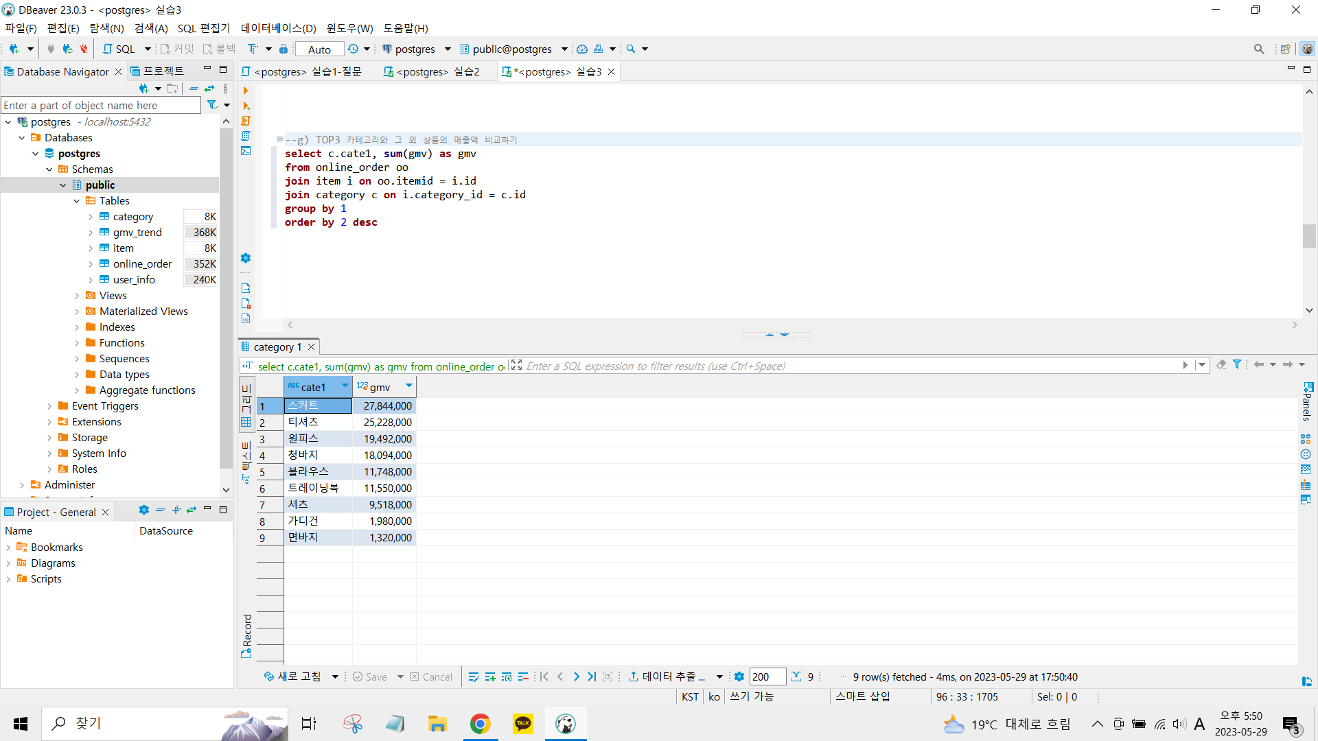 top3 제품을 알기 위해서 join을 사용하여 상품별 매출액 비교하기