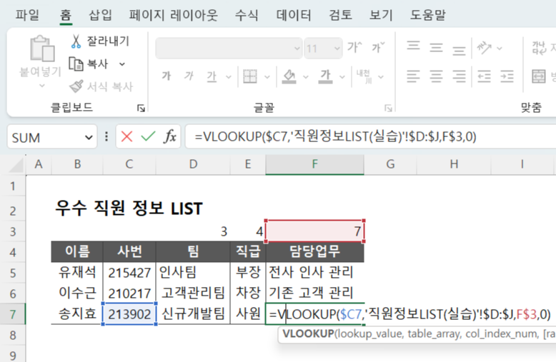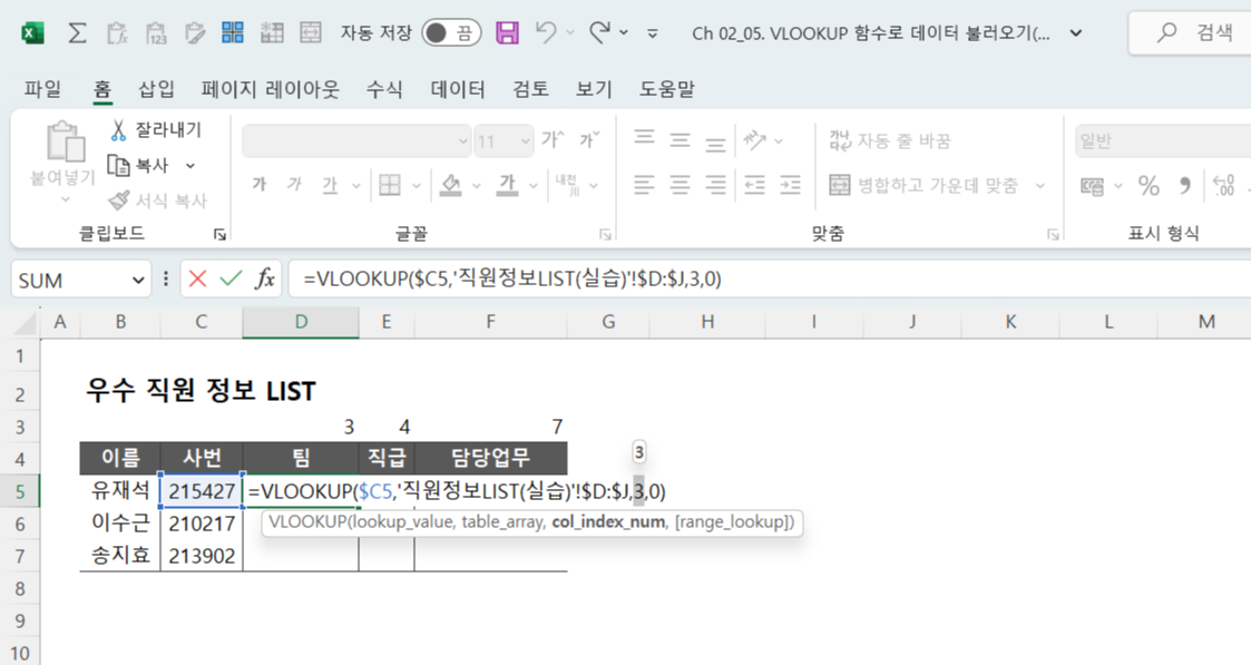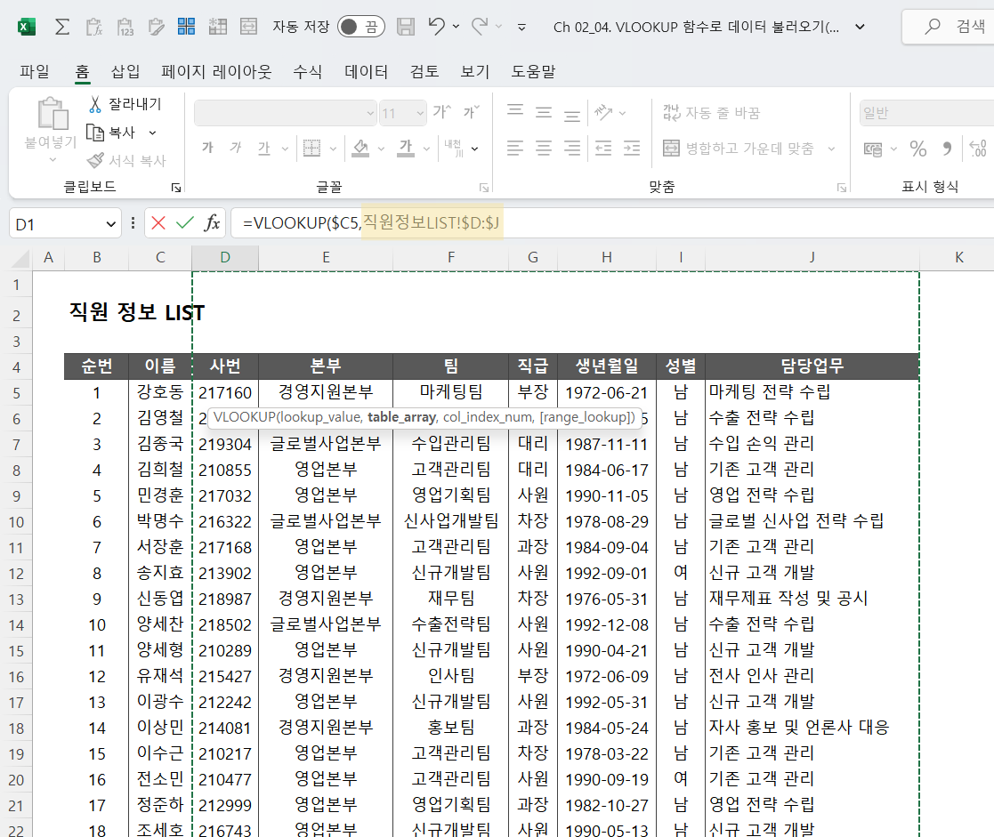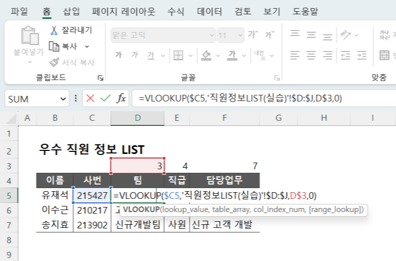 =VLOOKUP($C5,'직원정보LIST(실습)'!$D:$J,D$3,0)