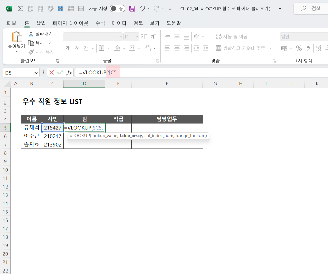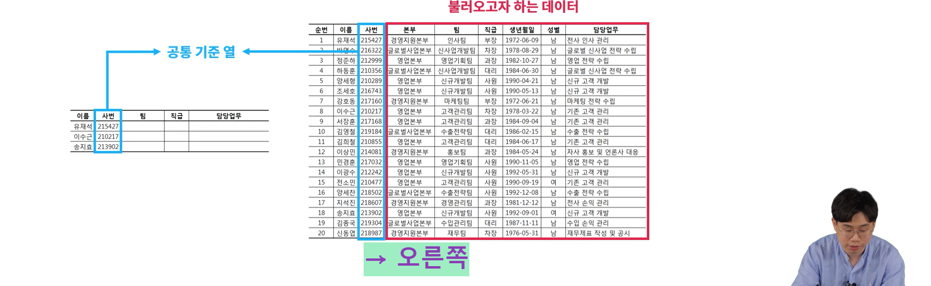 - 현재 작성 중인 표와 원래 데이터 간의 공통 기준 열이 있어야 함 (EX. 하단 사진의 사번 열)