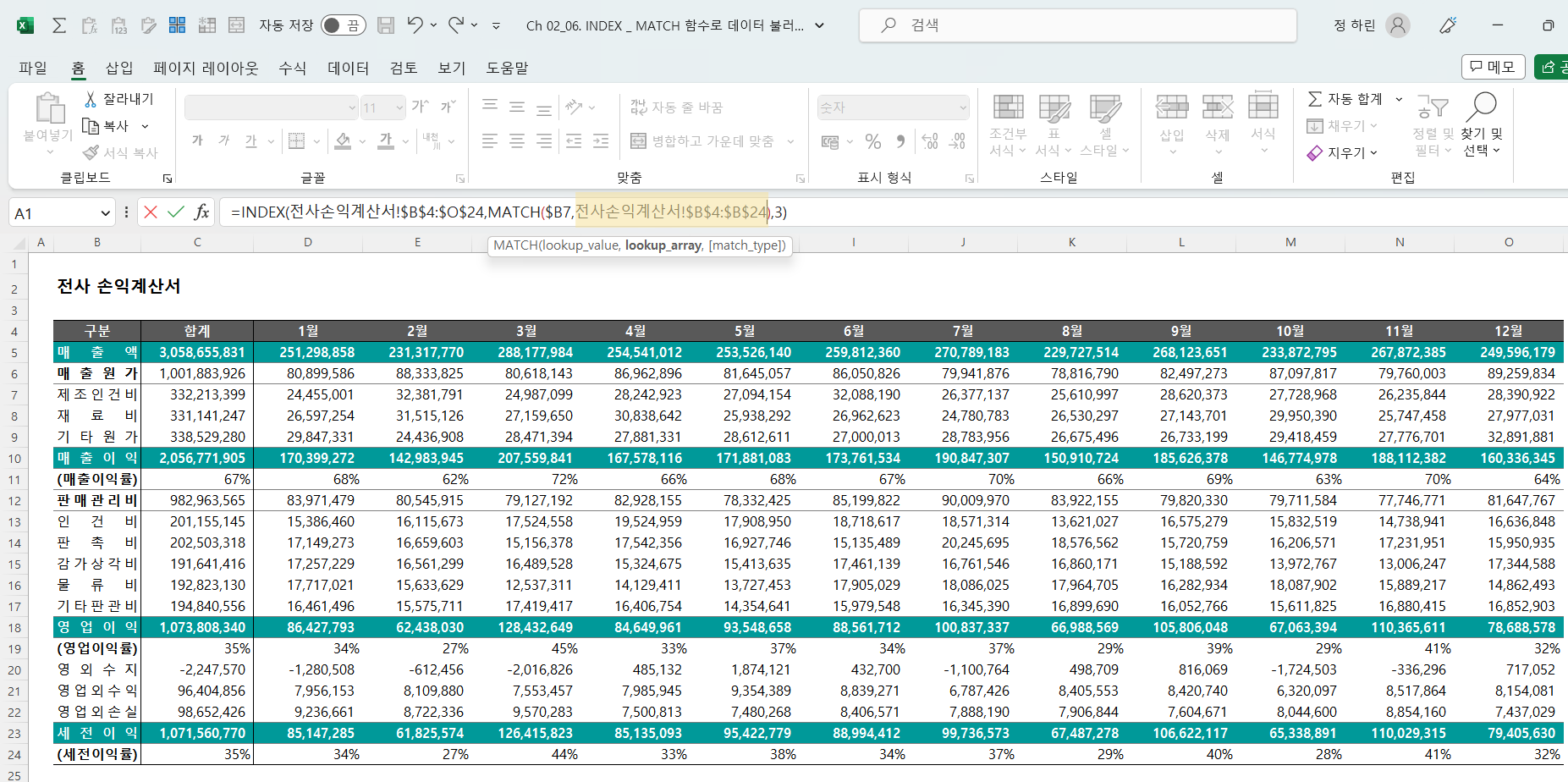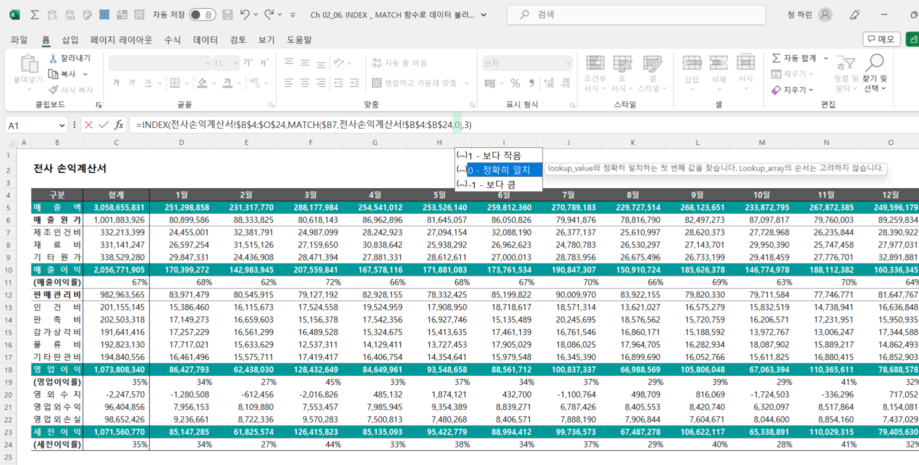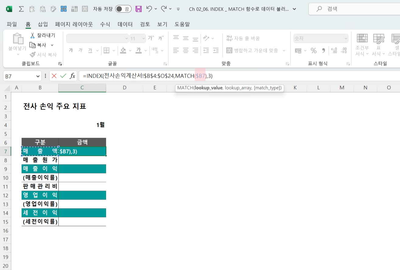 = MATCH($B7, 전사손익계산서!$B$4:$B$24, 0)