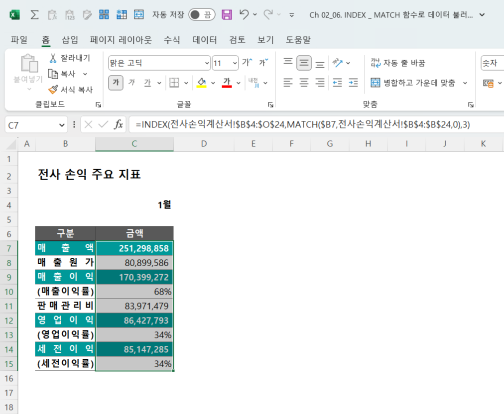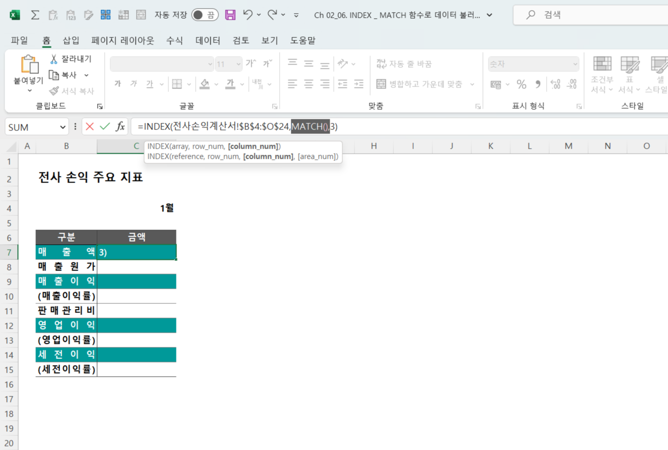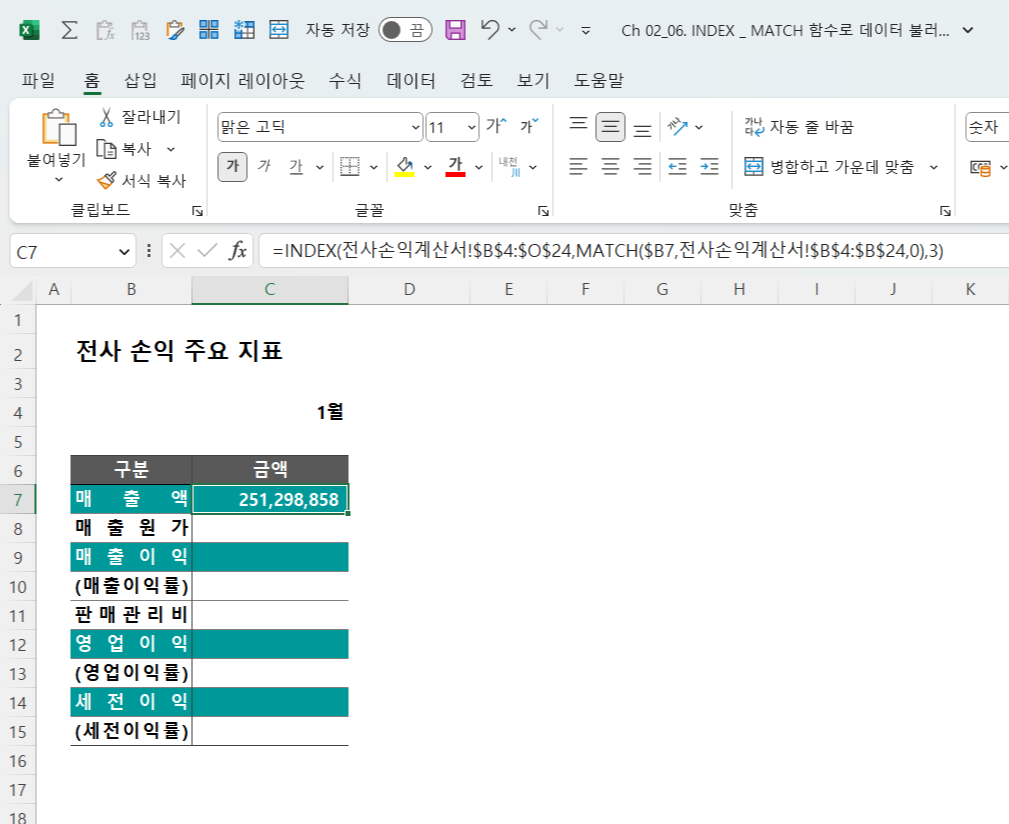 = MATCH($B7, 전사손익계산서!$B$4:$B$24, 0)