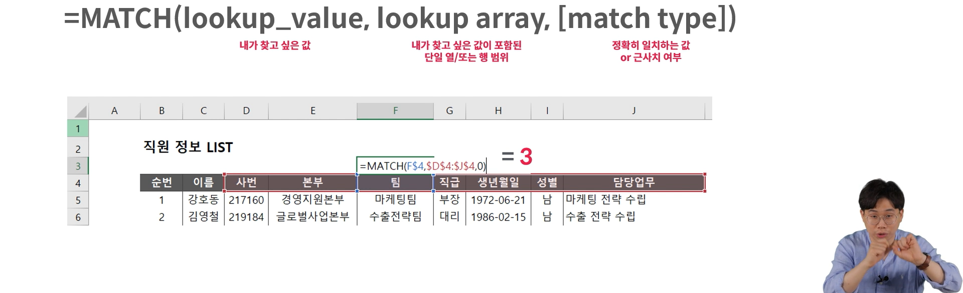| = MATCH(찾고 싶은 값, 찾고 싶은 값이 포함된 단일 행/열 범위, 0) |