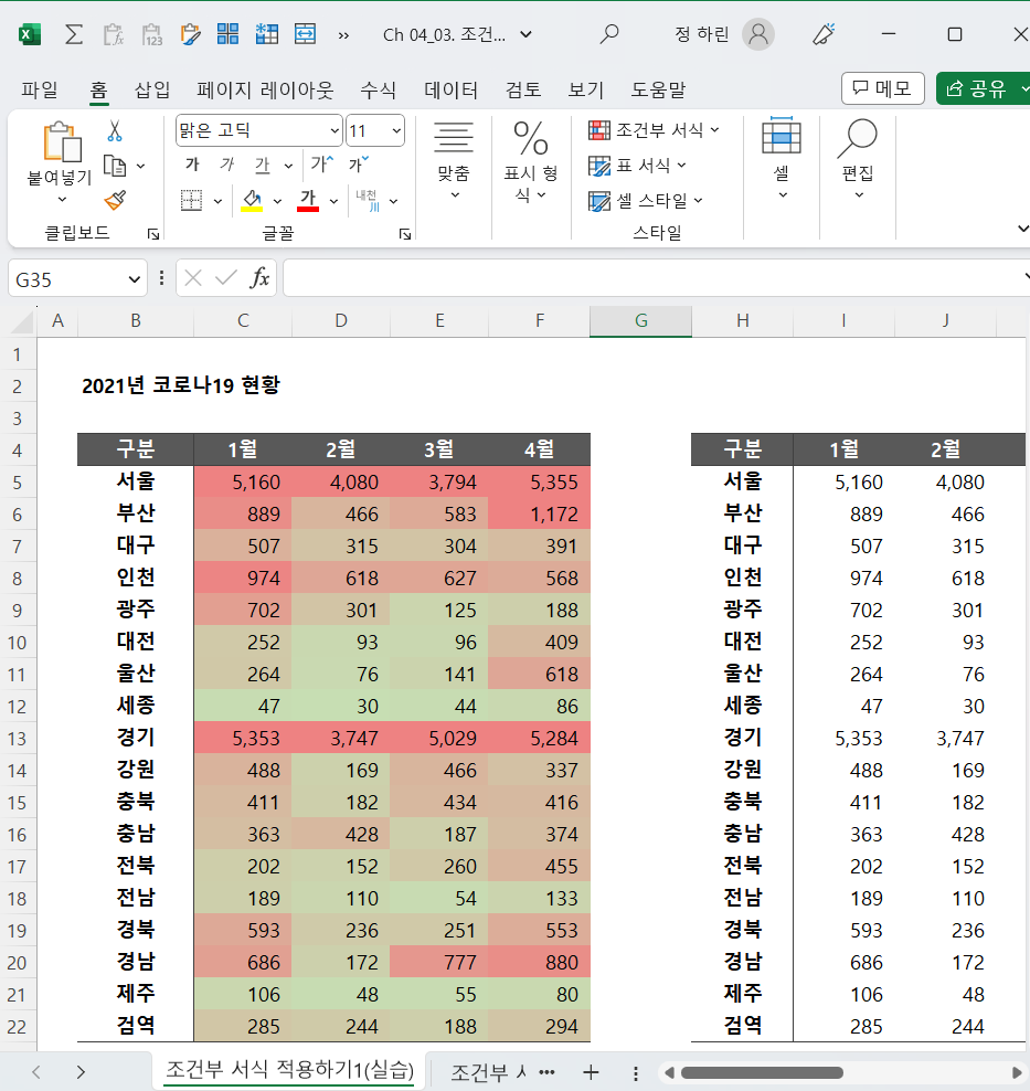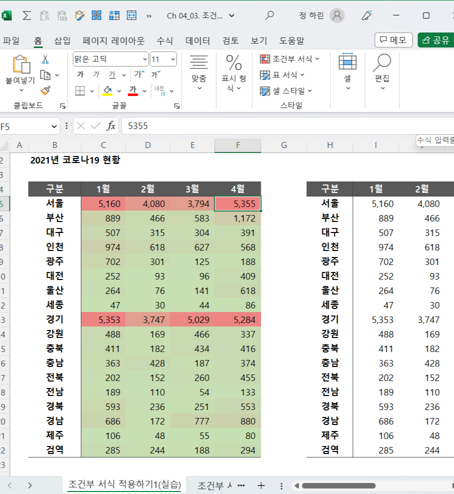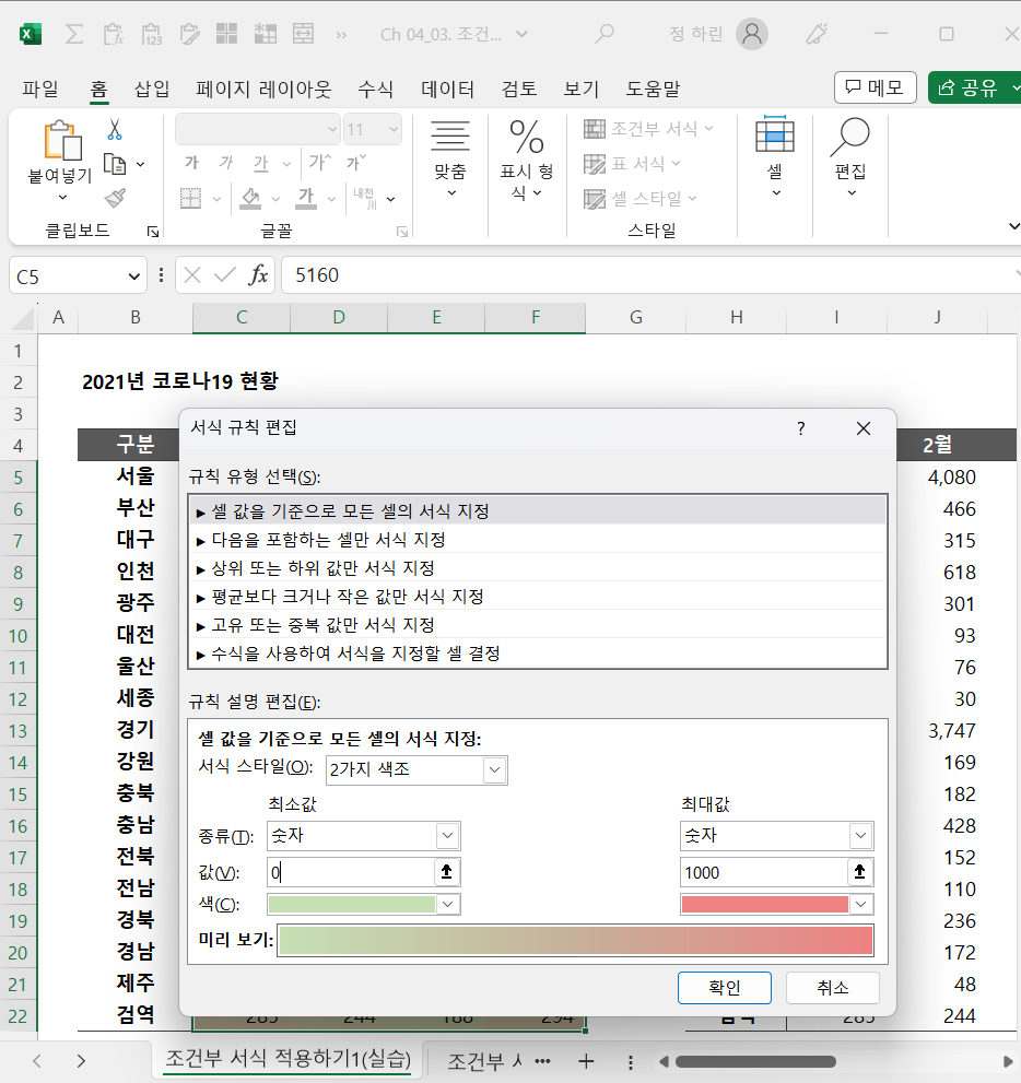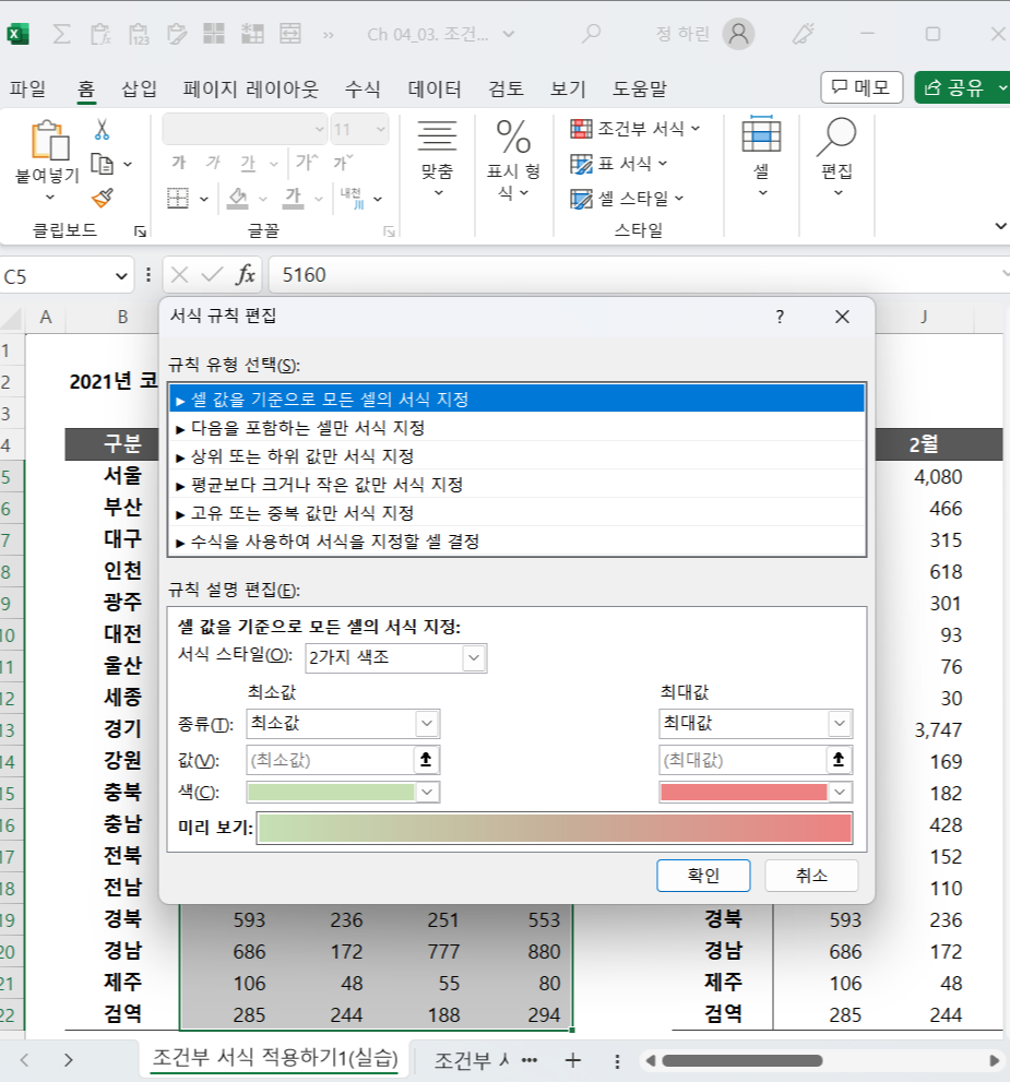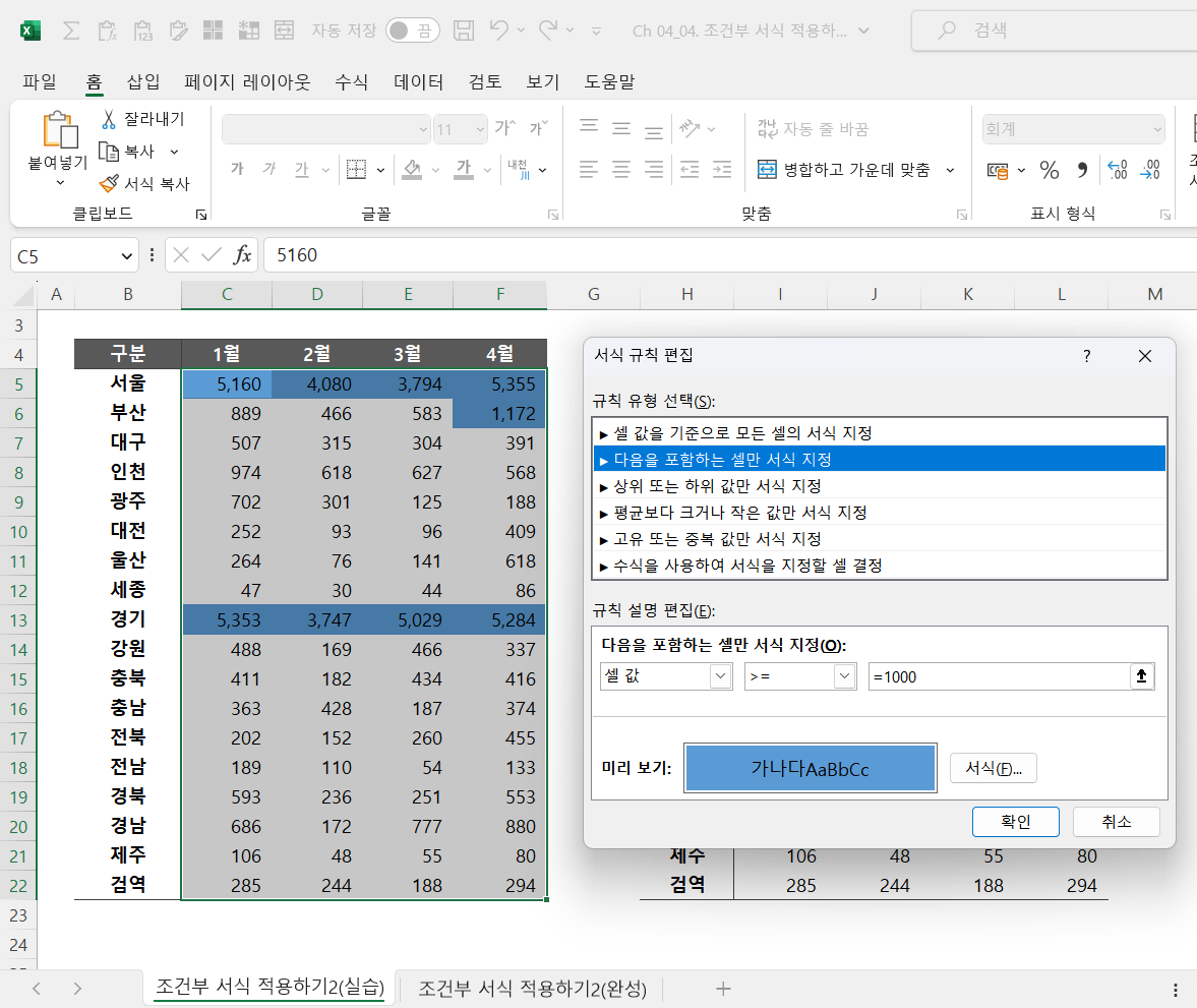 : 선택한 범위에서 특정한 조건을 만족하는 데이터에만 서식 적용