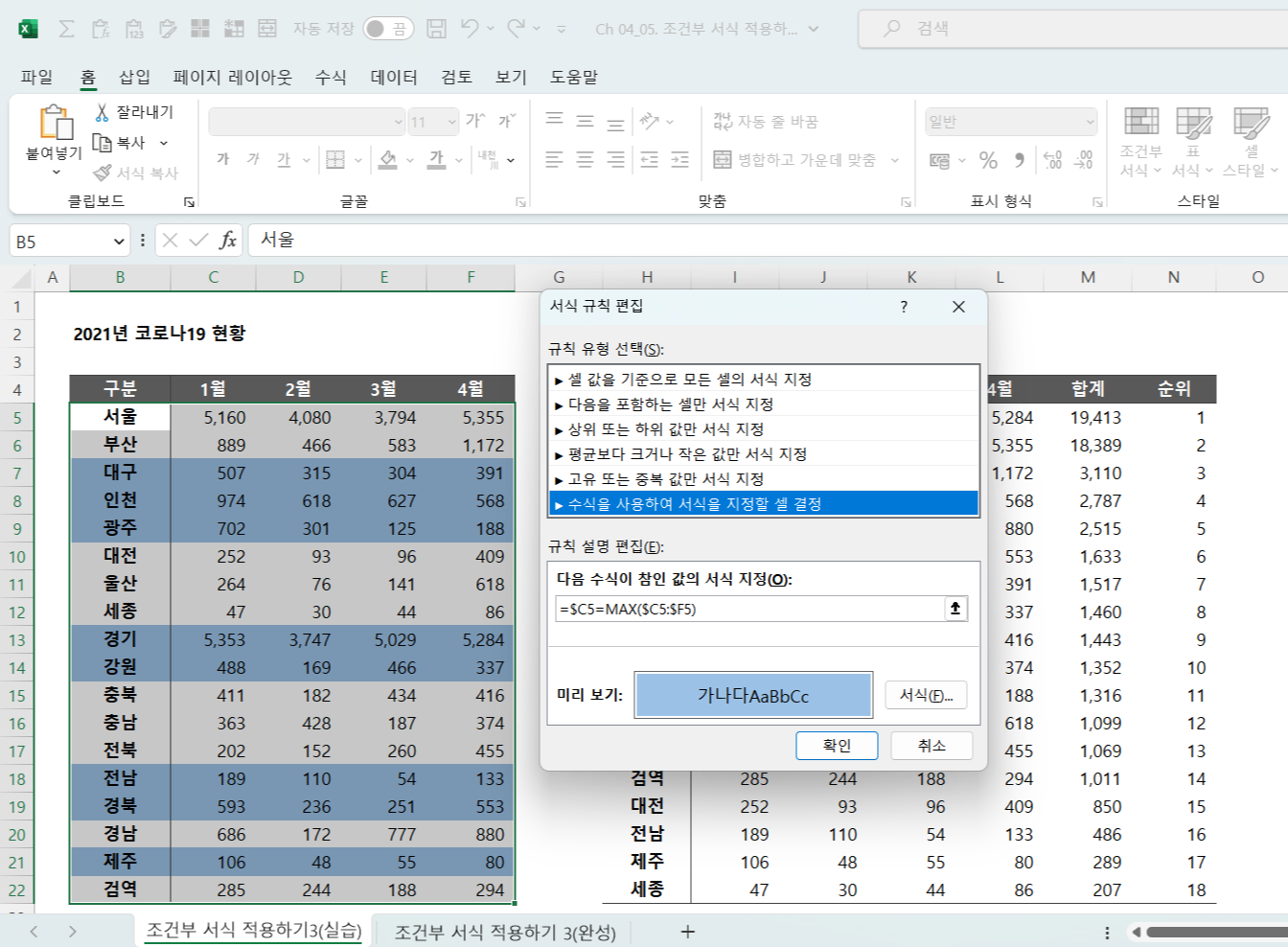 4. 수식을 사용하여 서식을 지정할 셀 결정