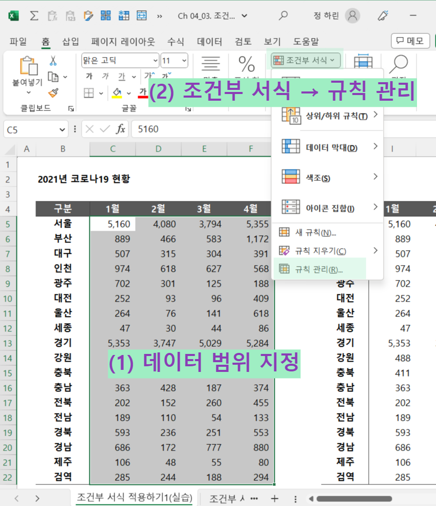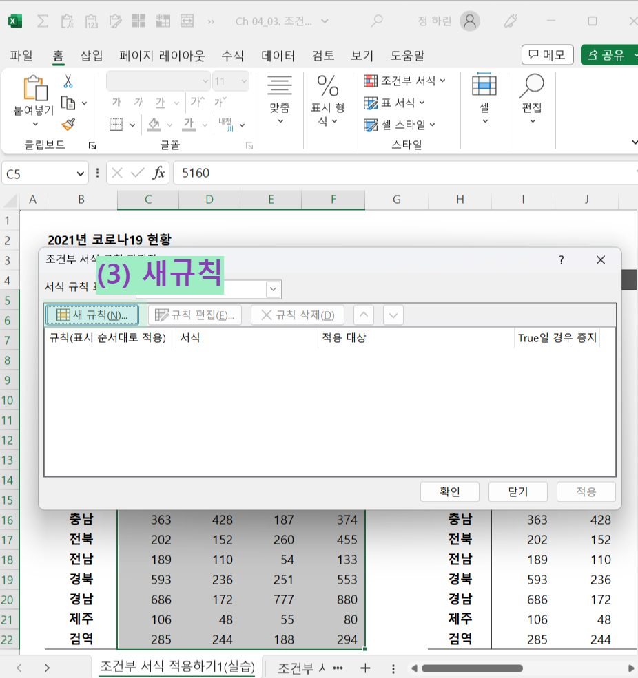 A. 서식을 걸 데이터 범위를 선택 → 홈 탭의 '조건부 서식' → 제일 하단의 '규칙관리' → '새규칙' 생성
