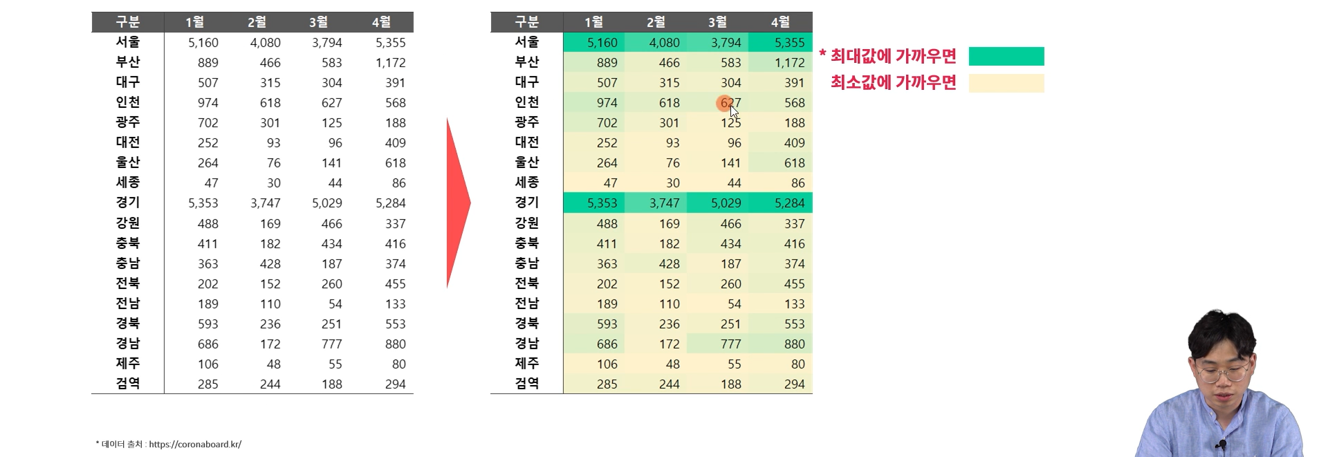 | 조건: 확진자 수가 적을수록 초록색, 많을수록 붉은색으로 지정 |