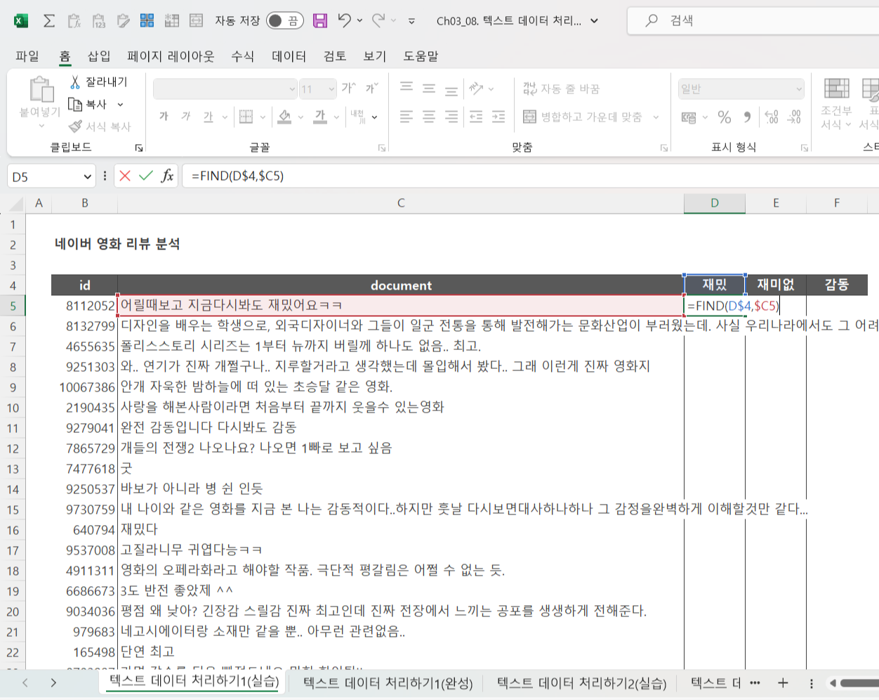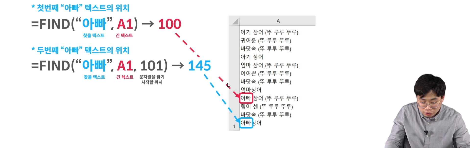 함수식: =IFERROR(FIND(D$4,$C5),0)