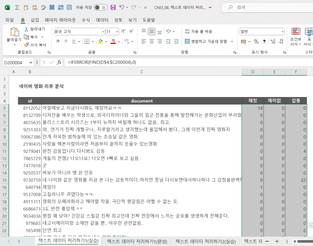 FIND함수와 COUNTIFS함수를 사용하여 주요 키워드를 언급한 사람의 수를 구할 수 있다