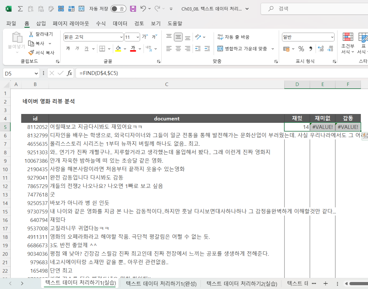 : 특정 키워드를 언급한 사람의 칸에는 숫자가 표시, 언급하지 않은 사람의 칸에는 오류#VALUE! 가 난다.