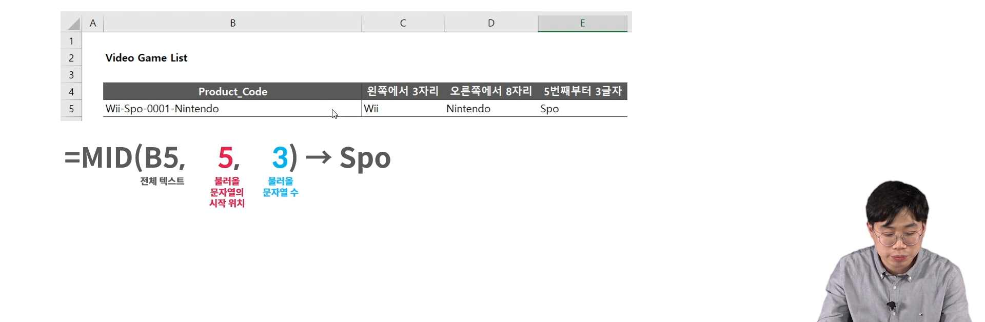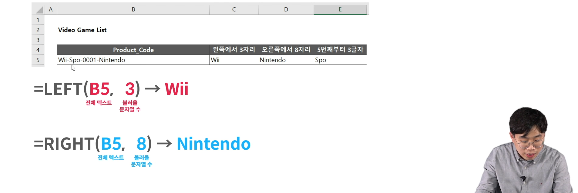 | 함수식 | =LEFT(B5,3) | =RIGHT(B5,8) | =MID(B5,5,3) |