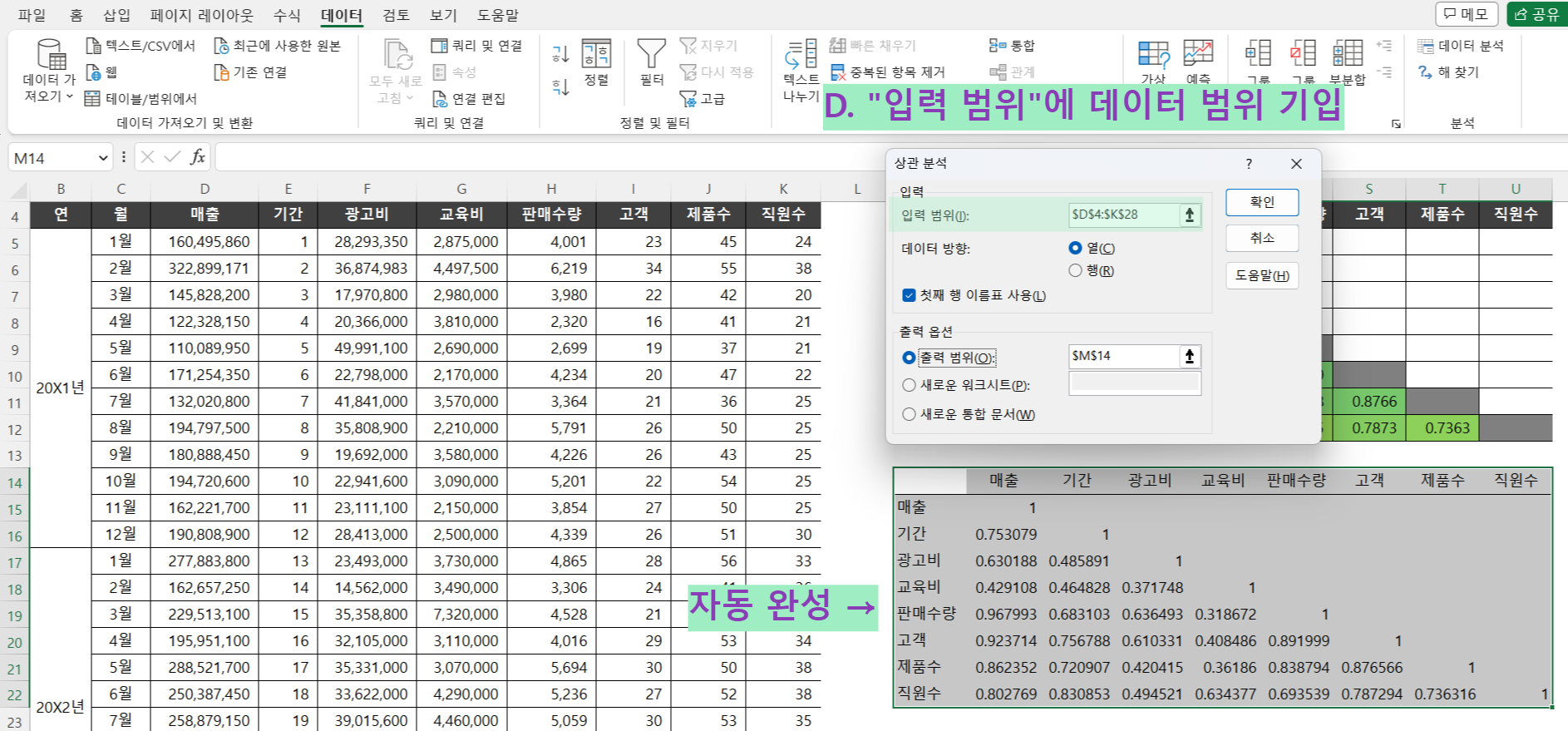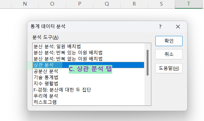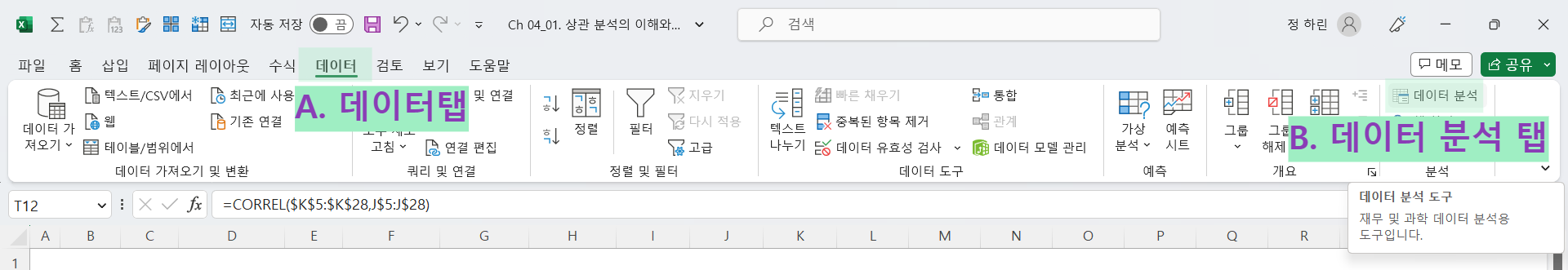 (1) 상단의 "데이터" 탭 → "데이터분석" 탭 → "상관 분석" 탭 클릭