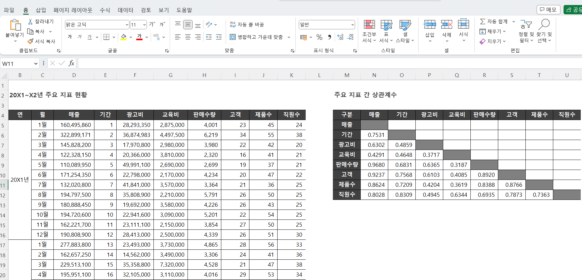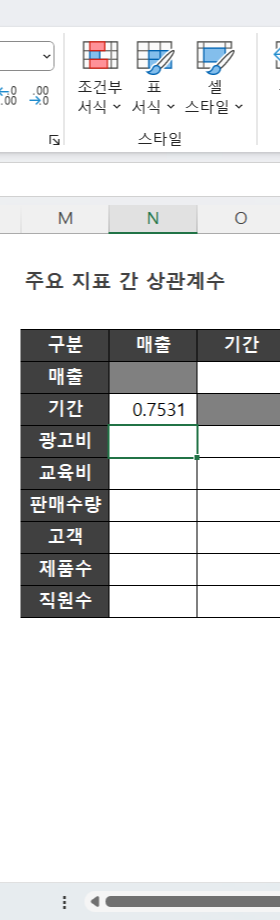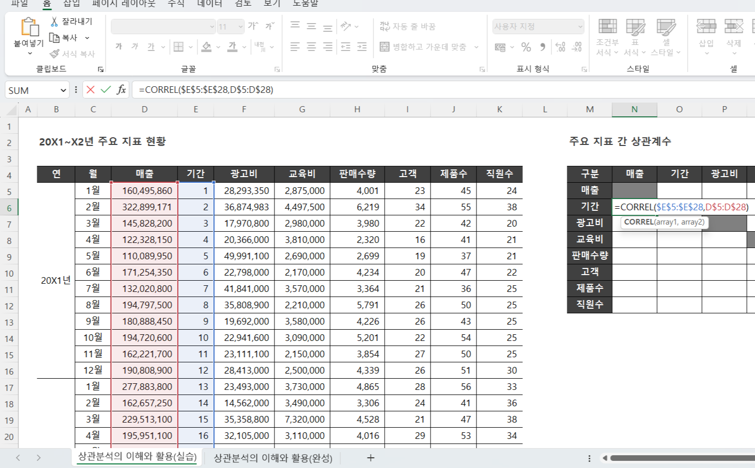 함수식 =CORREL(기간, 매출)