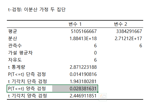 (1)"데이터" 탭 → "데이터분석" 탭 → "T검정: 이분산 가정 두 집단" 탭