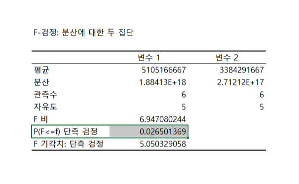 (3) 결론: P값이 0.05보다 작으므로, 상반기 하반기에 분산의 차이가 있다.