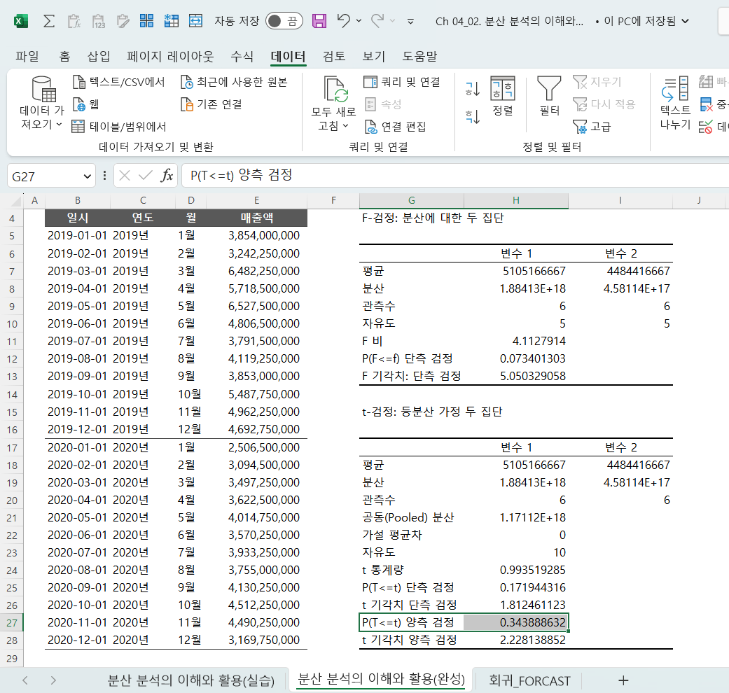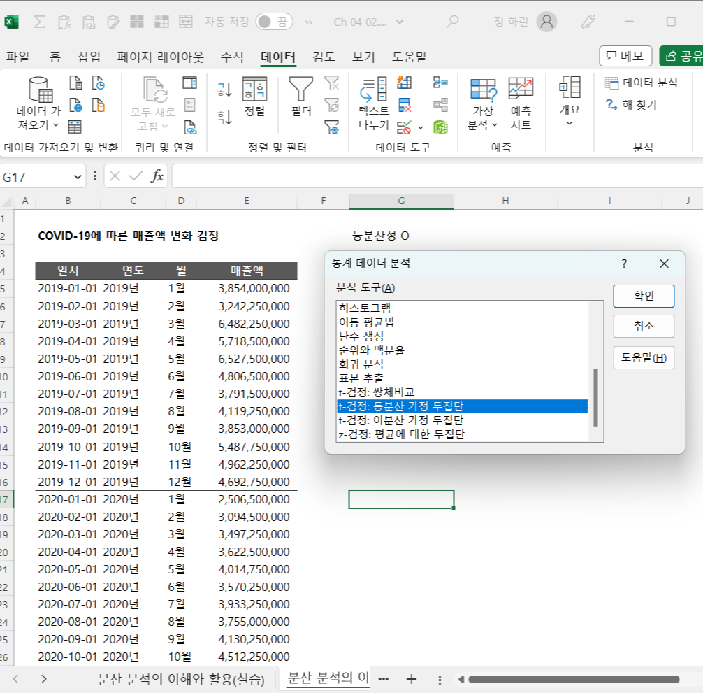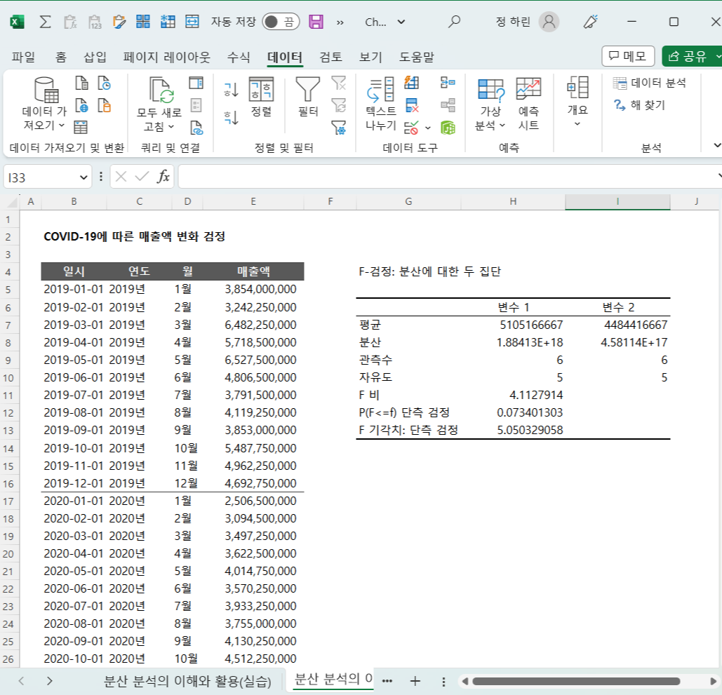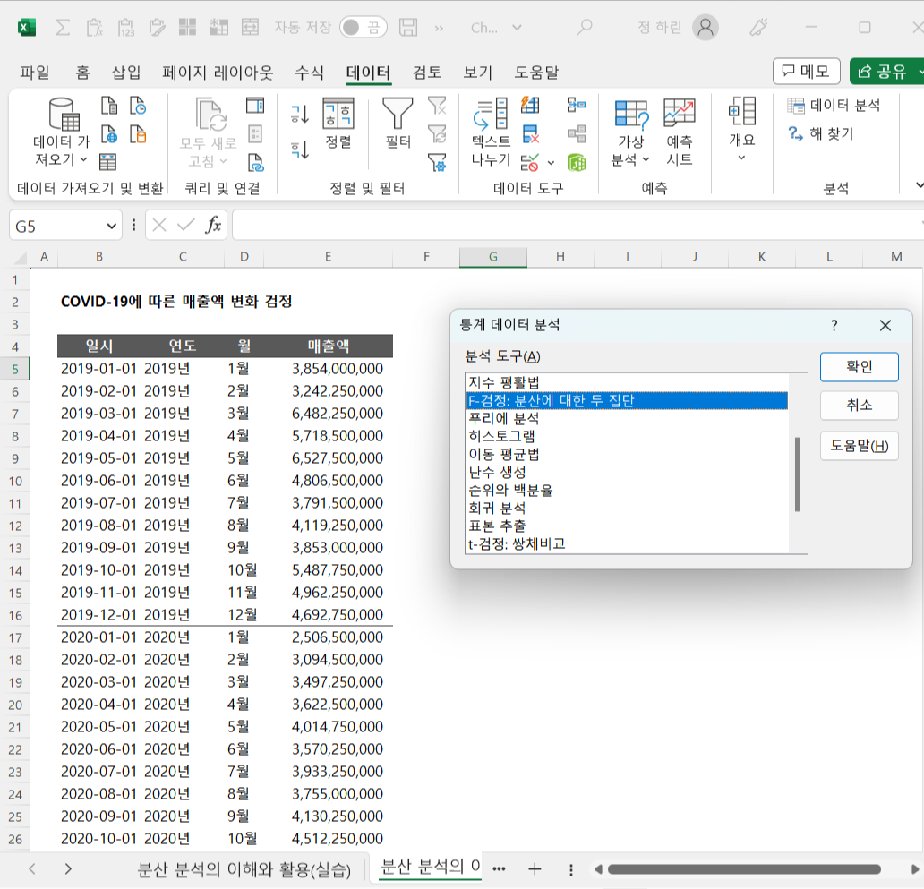 01) F검정: 상반기와 하반기 사이의 매출액 분산 분석