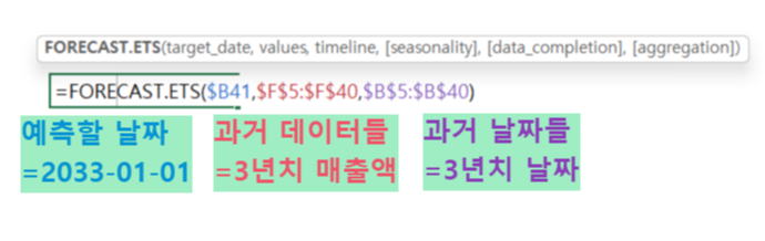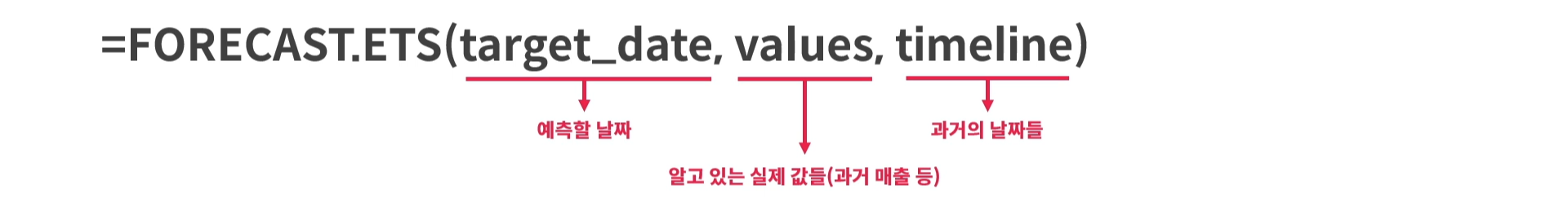 | =FORECAST.ETS(예측할 날짜, 과거 데이터들, 과거 날짜들) |