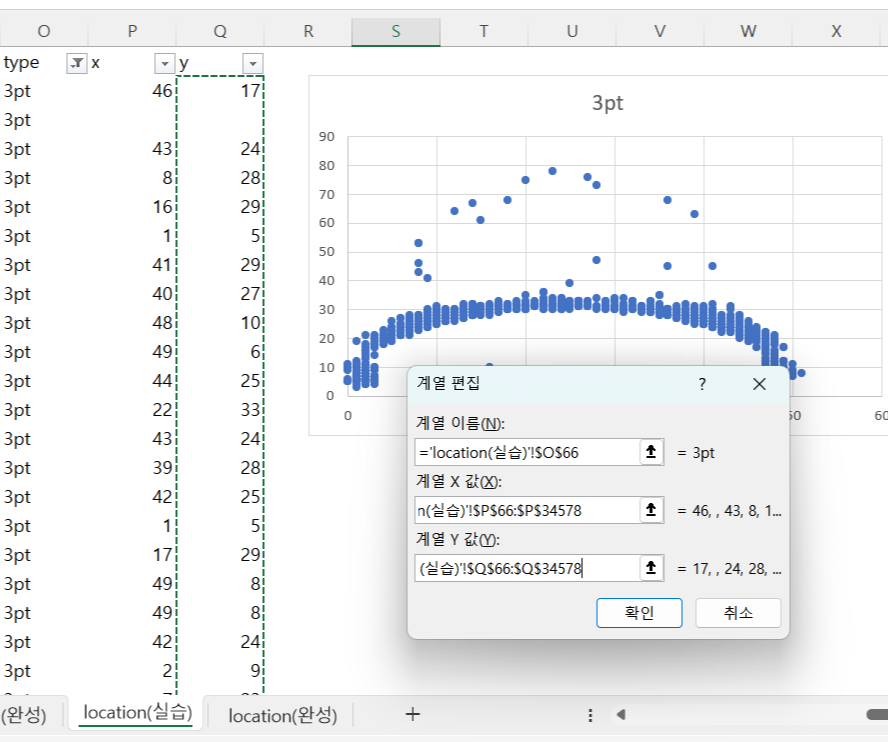 2) 시각화 하기 위해 분산형 차트를 삽입