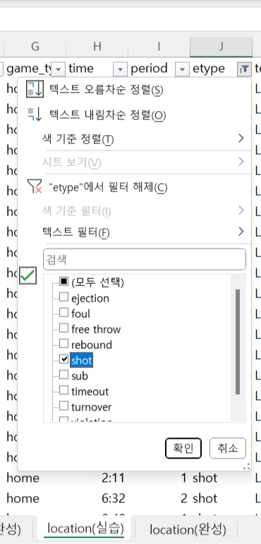 - 경기 etype은 골을 넣은 것을 볼 것이기 때문에 shot