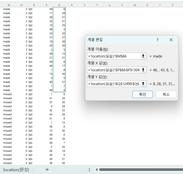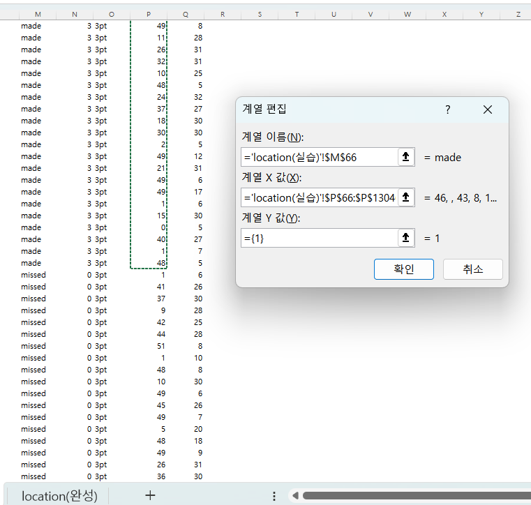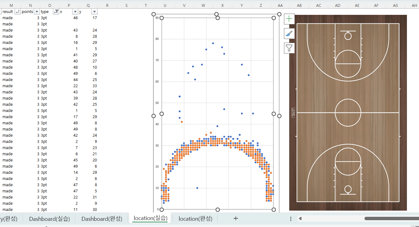 지금 그래프에는 성공(made)한 3점슛과 실패(missed)한 3점슛이 모두 표시가 되어 있으므로