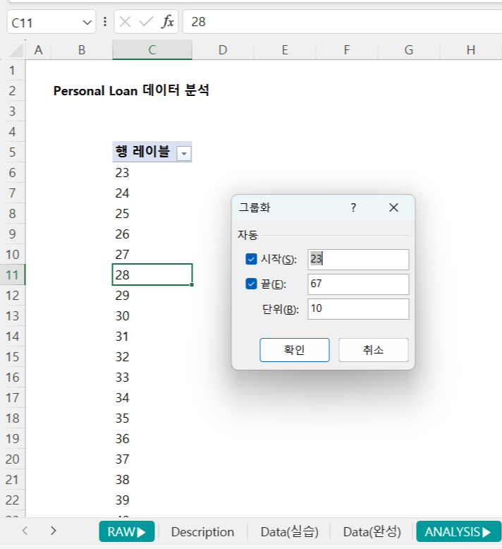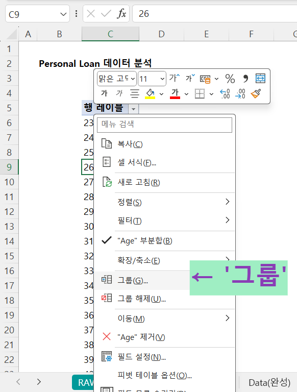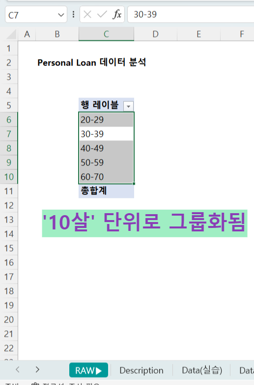 - 전체로 나열되어 있는 나이 데이터를 연령대(10대별)별로 '그룹'화(마우스 우클릭) 하기