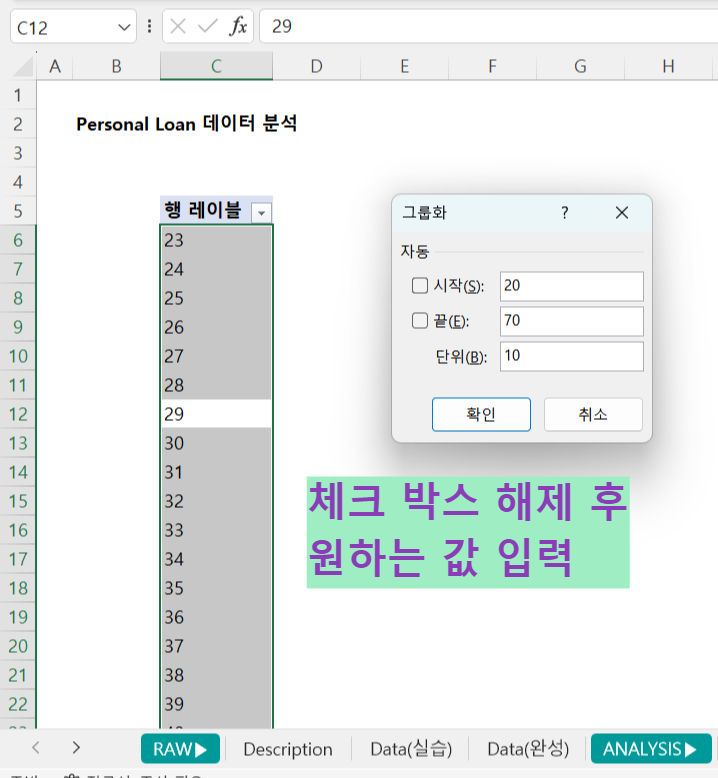 - 시작과 끝에 체크박스✅를 해제하고, 원하는 시작값(20)과 끝값(70), 단위값(10)을 입력한다