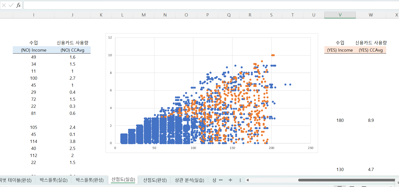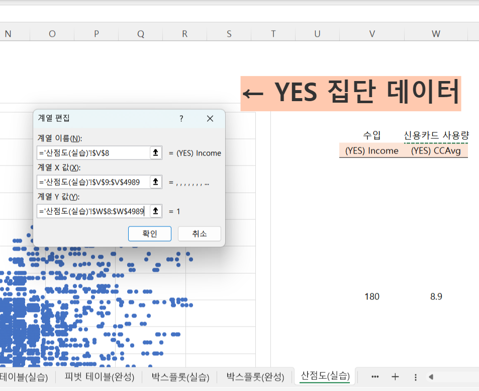 - 같은 분산형 그래프에 YES집단 데이터 추가하기