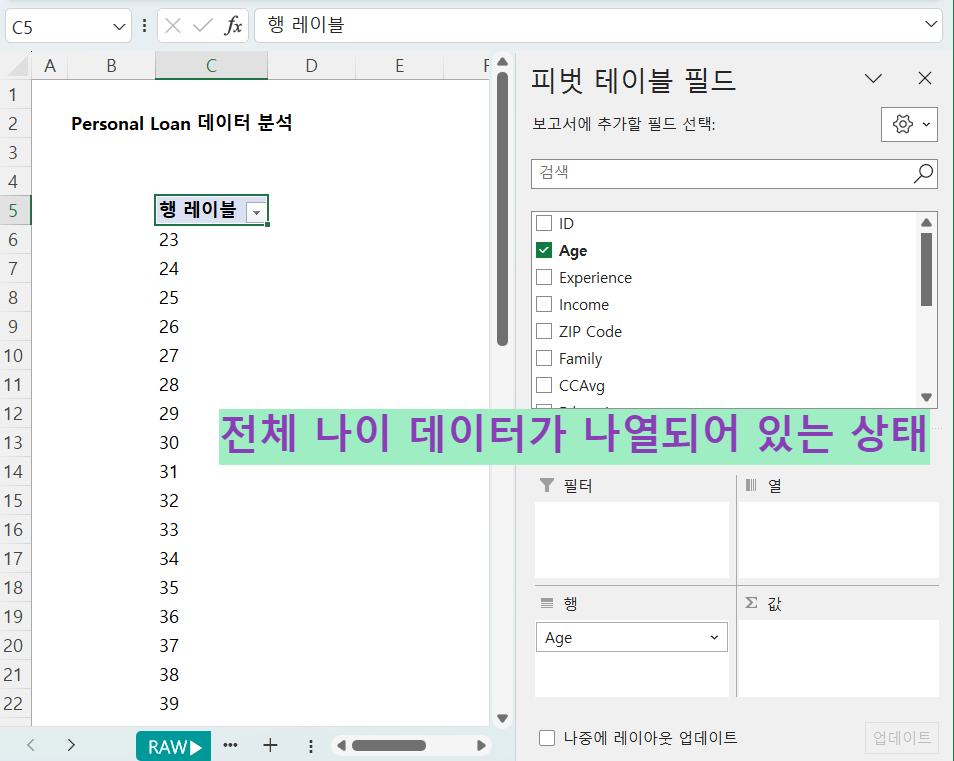 1) 피벗 테이블을 삽입하여 데이터 그룹화 하기: Age