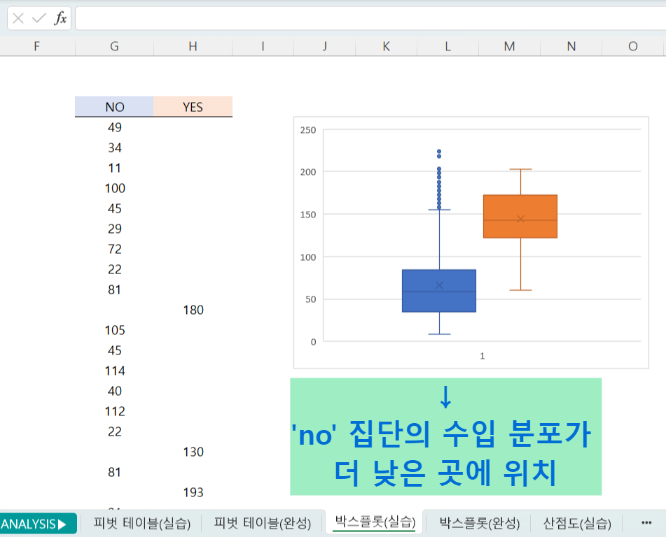 - 박스플롯의 위치를 통해 NO 집단의 소득이 더 낮은 것을 확인할 수 있다.