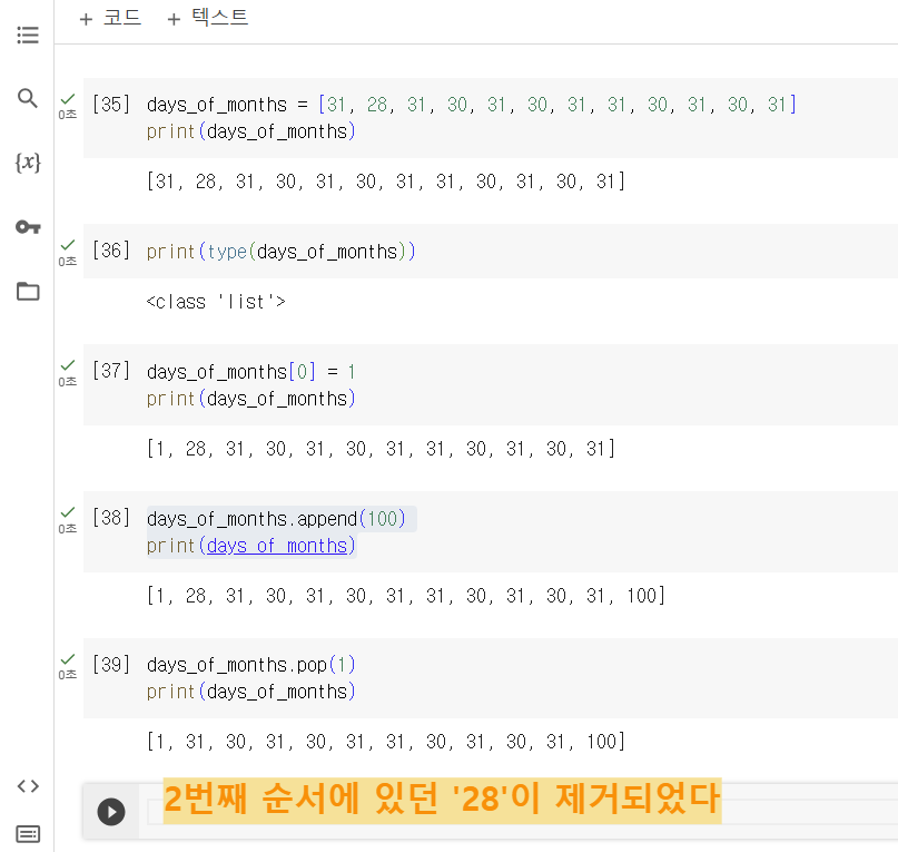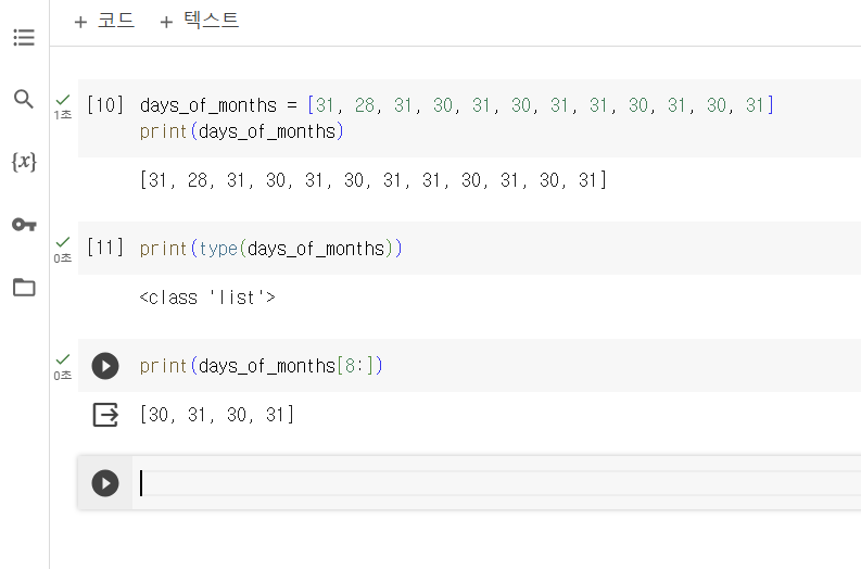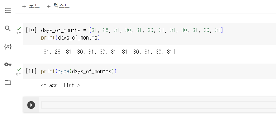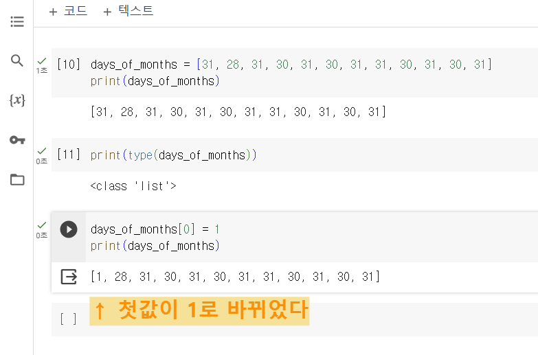예시: 1년 12달 각각의 날 수를 days_of_months라는 리스트 변수로 정의해보자