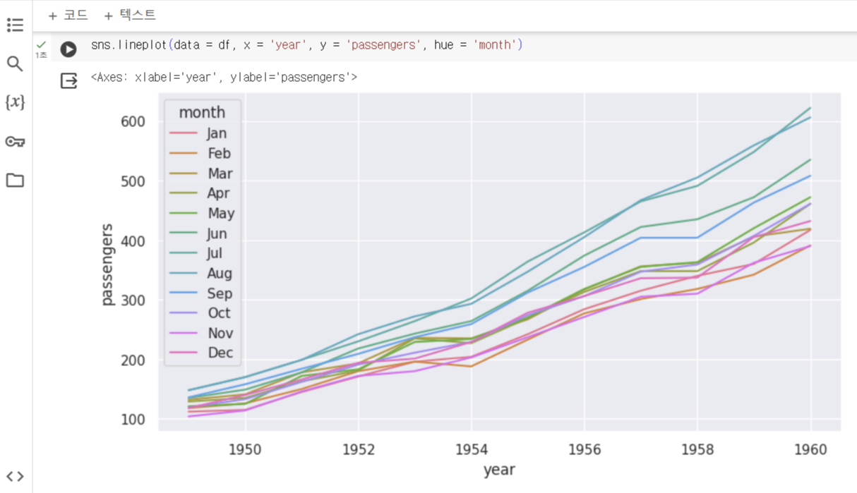 | 코드 입력 | sns.lineplot(data = df, x = 'year', y = 'passengers', hue = 'month') |