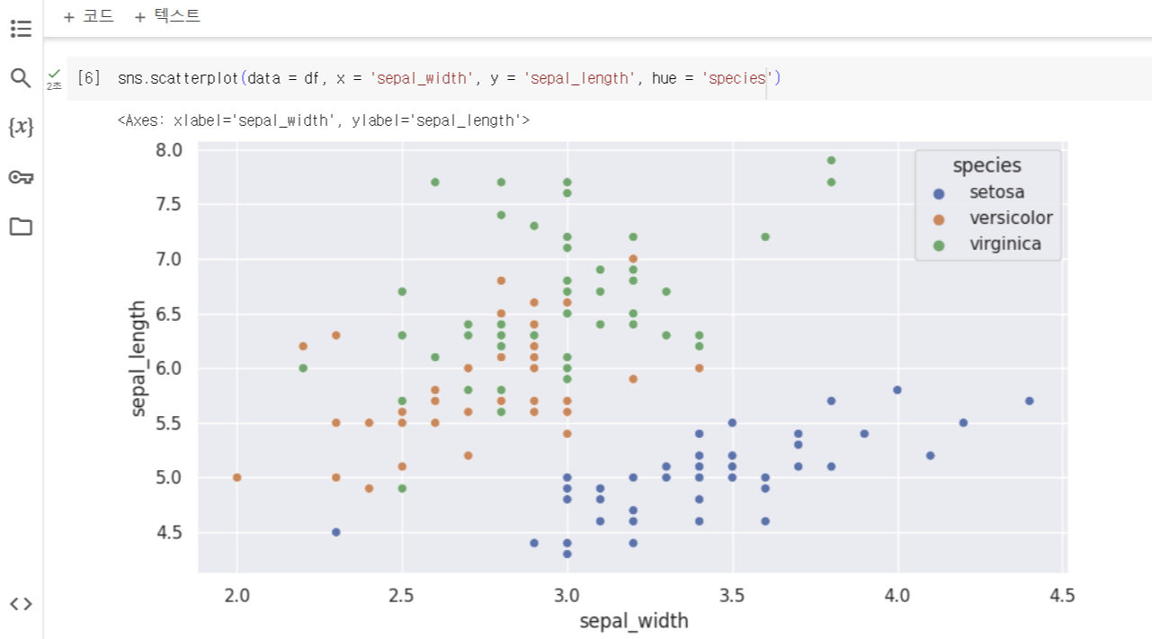 | 코드 입력 | sns.scatterplot(data = df, x = 'sepal_width', y = 'sepal_length', hue = 'species') |