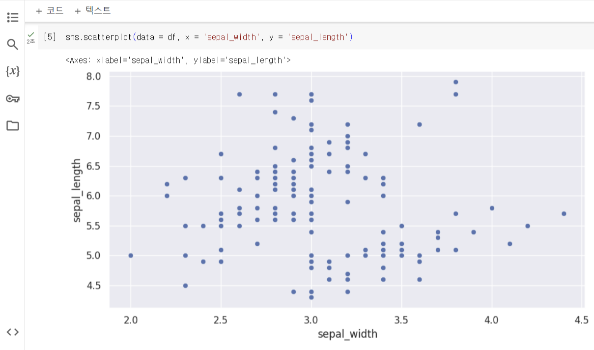 | 코드 입력 | sns.scatterplot(data = df, x = 'sepal_width', y = 'sepal_length') |