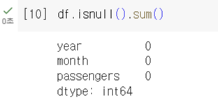 | 해석 | sns.lineplot을 만들 때 데이터는, 상단의 df를 사용한다. x값을 연도'year'로, y값을 승객수'passengers' 로 지정한다. |
