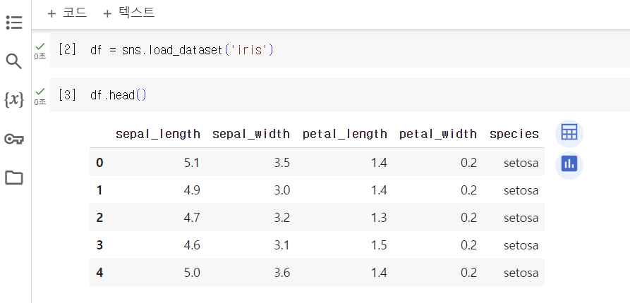 iris라는 데이터셋을 df라는 변수에 입력해주고,